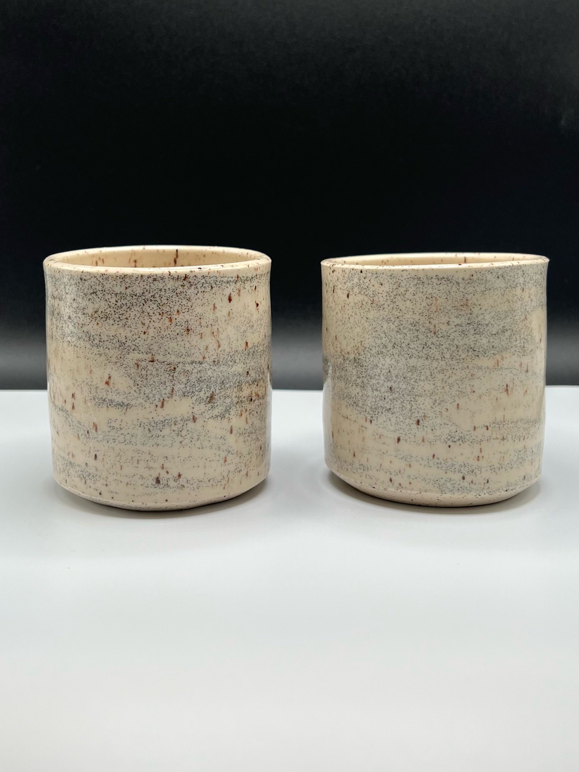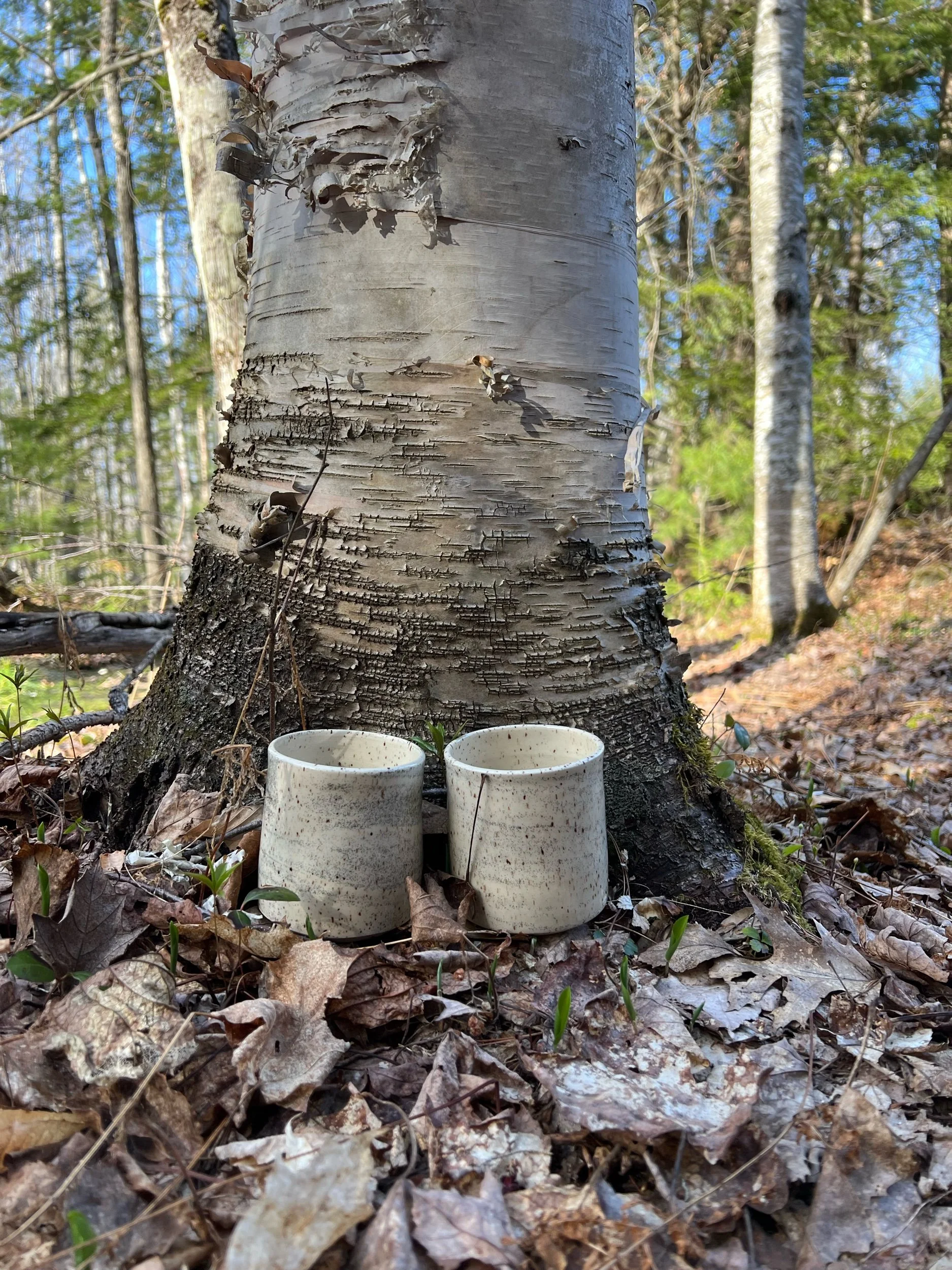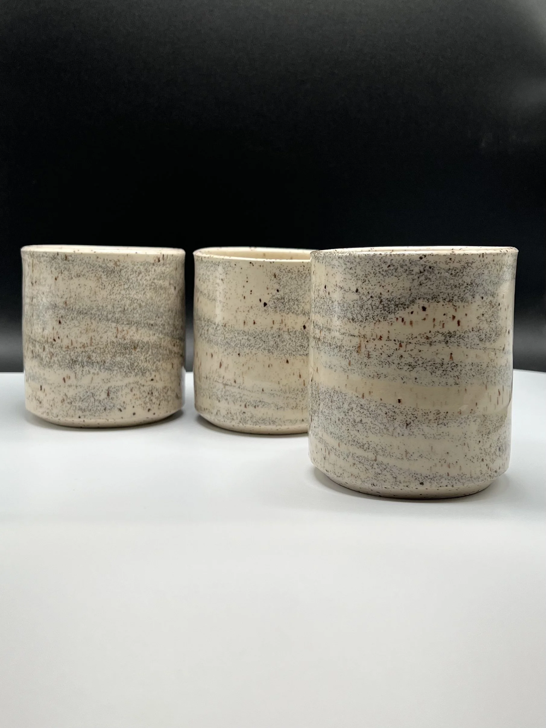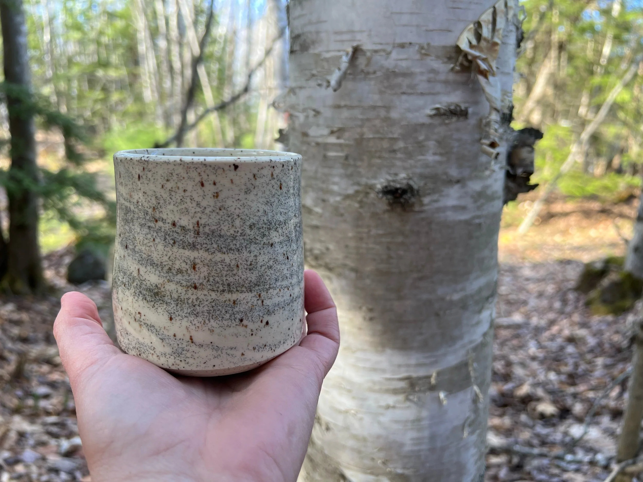 Inspired by birch and aspen trees. Swirled clay with black and brown specks. If I’m being honest, I can’t tell a birch from an aspen, but aspens are one of the most common trees in the US, so hopefully these mugs resonate with you as much they resonate for me.